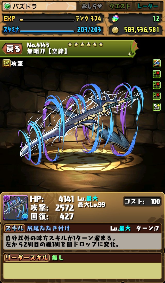 全ドロップを闇と回復ドロップに変化。 (最短14ターン) 1ターンの間、チーム内のコンボ強化の覚醒数に応じて攻撃力が上昇。 ドロップ確率は低いと思われるが、まずはダンジョンを攻略してから検討するのがおすすめ。 光の2コンボで攻撃力が25倍、3コンボ以上で35倍。 s 左端縦1列を光に、右端1列を回復ドロップに変化。 4ターンの間、光ドロップが落ちやすくなる。 (ターン数;10) 覚醒 超覚醒7794(15) 2346(2624) 450(473) スキル;